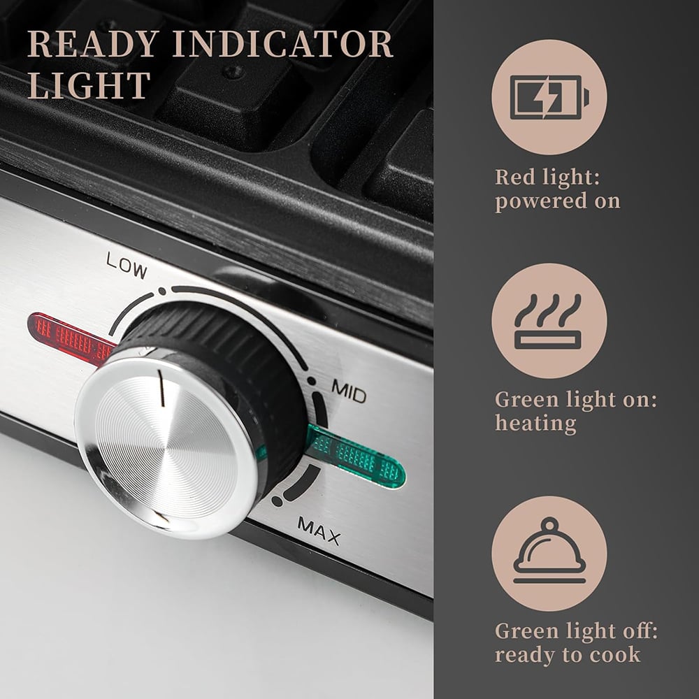 The insulated handle stays cool during operation, allowing you to open and close the waffle maker safely without burns.